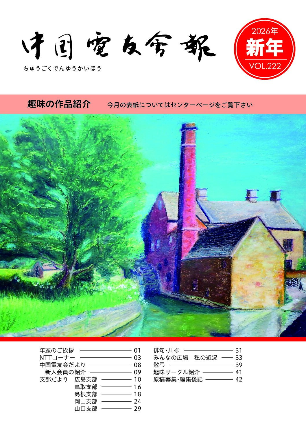 本部トップページ 2025.08.262025.09.15 中国電友会のホームページが新しくなりました。 INFORMATION サークル利用予定表(2026年3月) サークル利用予定表(2026年3月) 2026.01.16 サークル利用予定表(2026年2月) サークル利用予定表(2026年2月) 2026.01.16 2026年1月号 VOL.222 2026電友会新年号ダウンロード 2025.12.262026.01.14 サークル利用予定表(2026年1月) サークル利用予定表(2026年1月) 2025.12.092026.01.16 サークル利用予定表(2025年12月) サークル利用予定表(2025年12月) 2025.11.272026.01.16